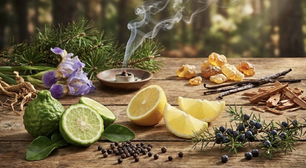 つけた瞬間は、レモンやベルガモットの爽やかな柑橘系と、ペッパーのスパイシーさが弾けます。しかし、すぐにその奥から、お香のようなスモーキーさと、松葉の清涼感が顔を出します。