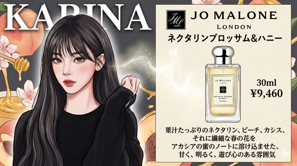 カリナさんの香水遍歴を語る上で、デビュー初期から愛用アイテムとして名前が挙がっていたのが、ジョー マローン ロンドン(Jo Malone London)の『ネクタリン ブロッサム & ハニー(Nectarine Blossom & Honey)』です。
