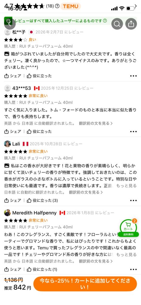 口コミをチェックしてみると、「トムフォードのロストチェリーと香りが似てる」という書き込みが想像以上に多かったんです。👇temuの口コミをご覧ください。